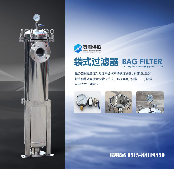 袋式過濾器是一種專業的液體過濾設備,它能有效地去除液體中的污染物,改善液體的品質。使用袋濾機過濾時,液體自袋濾機右側的入口處進入機體,由濾袋的上方沖入袋中,濾袋因液體的沖擊與均勻的壓力而展開并壓附在不銹鋼篩網的網壁上,液體即順流通過濾袋,經篩網而流出,完成過濾的程序。被濾袋濾材所阻攔下來的污染物,則留置于濾袋內部,可以在清洗和更換濾袋時被清除。我公司 單袋和多袋各規格不銹鋼袋濾器,材質SUS304,封頭和筒體連接為快裝法蘭式,濾袋采用法蘭壓緊固定。